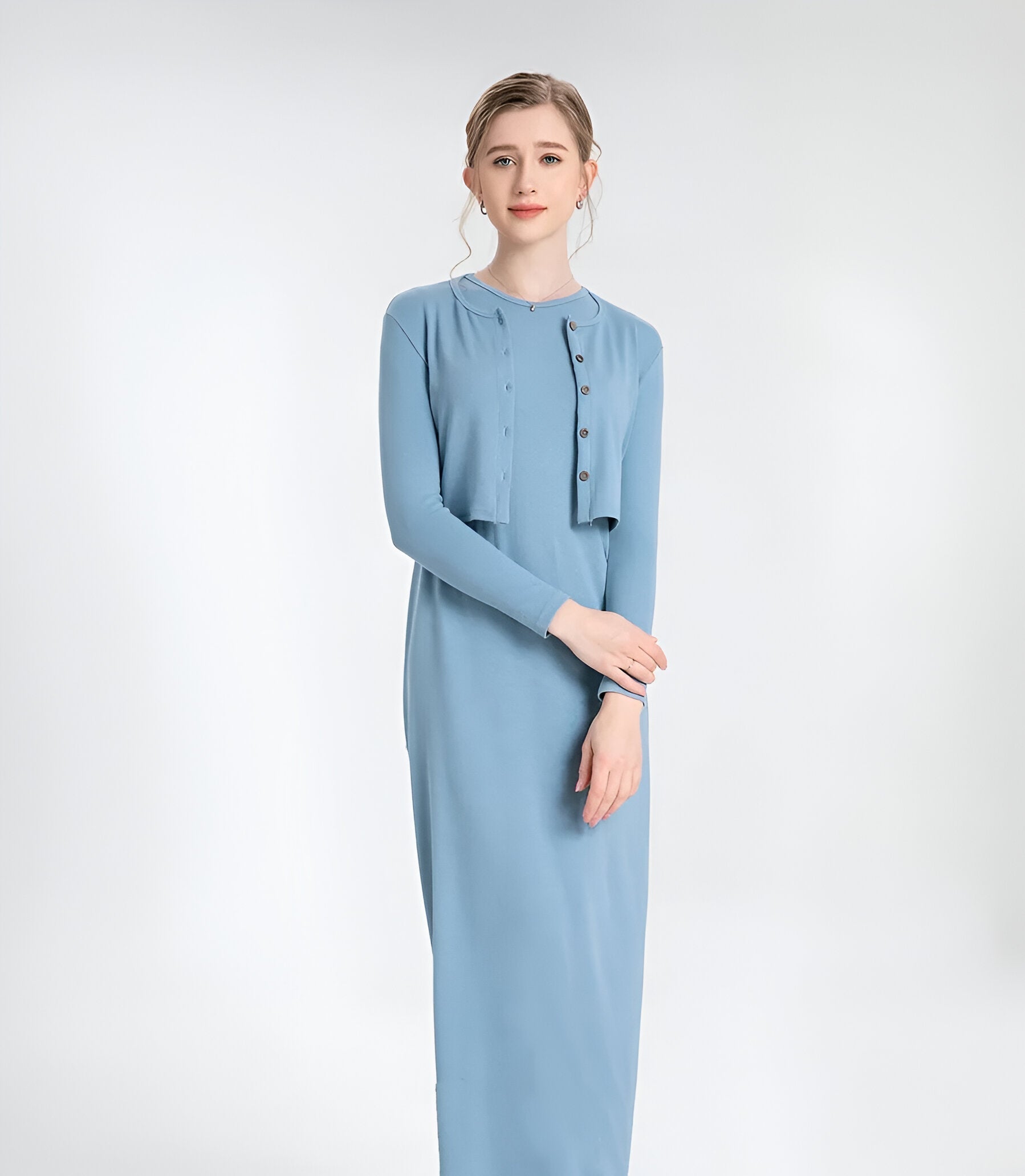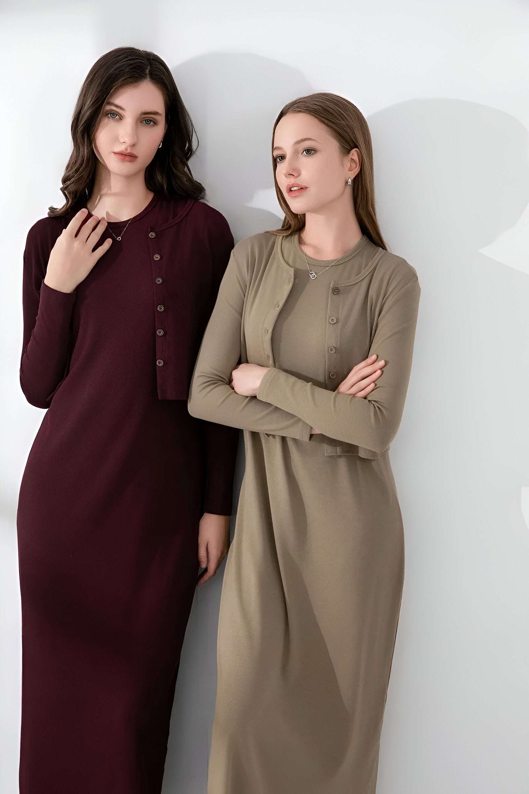 Imagine yourself enjoying a cosy evening or a relaxed day out, enveloped in the soft and stylish set. The versatile cardigan adds extra warmth, while the dress gives an elegant yet relaxed look.